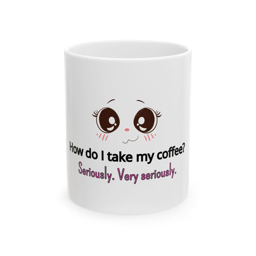 Coffee Mug — "How Do I Take My Coffee? Seriously. Very Seriously." Cute Kawaii Eyes Ceramic Mug (11oz/15oz)